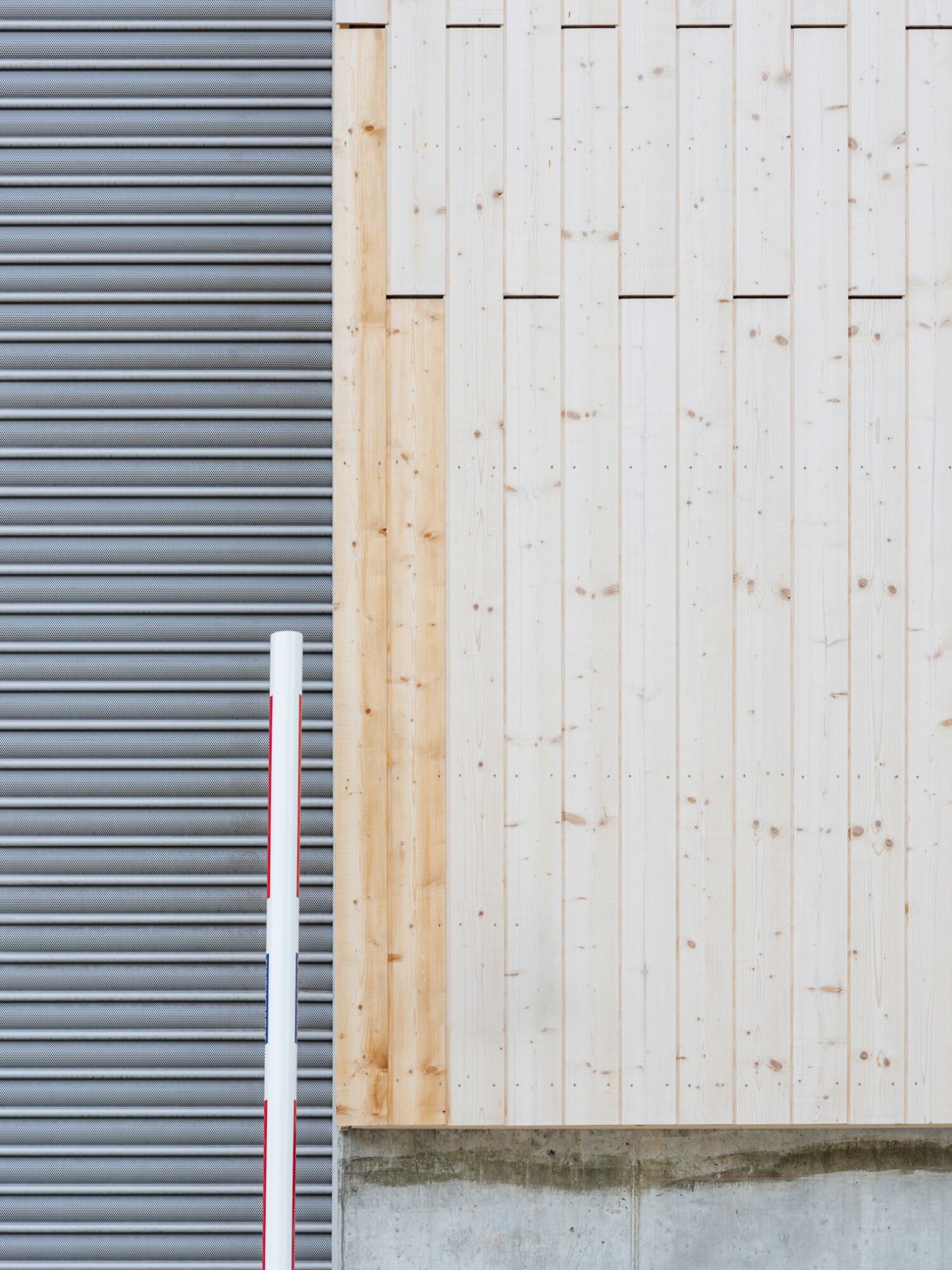 Two different treatments applied to the same facade demonstrate the effect of the timber sunscreen: a vertical facade with rough-cut, pre-greyed, tongue-and-grove boarding was used for the upper section. The rest of the facade is finished with the innovative UVood surface treatment that protects the wood from UV radiation, preserving its colour, smell and feel. The striking ‘CO2 neutral’ logo, which we designed, milled and installed on the facade for all to see, is eye catching.