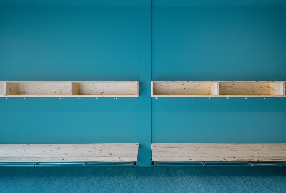 Das ganze Schulhaus ist im Innenraum in frischem Blau gehalten.
