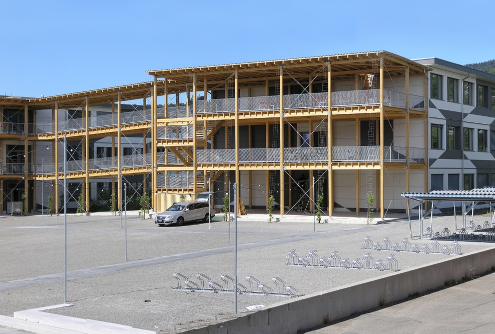 Der Holzmodulbau des Schulhausprovisoriums für die Kantonsschule in Uetikon sticht sofort ins Auge. Die Fassade mit dem geometrischen Muster in Grau und Weiss der Künstlerin Vreni Spieser verleiht dem Bau das einzigartige Erscheinungsbild. Angelegt ist die Nutzung des Provisoriums auf zehn Jahre. Es soll den Schülerinnen und Schüler sowie den Lehrpersonen in dieser Zeit eine optimale Lern- und Arbeitsatmosphäre bieten. Die Holzmodule können danach weitere 20 Jahre ihren Dienst erweisen und an einem anderen Ort eingesetzt werden.